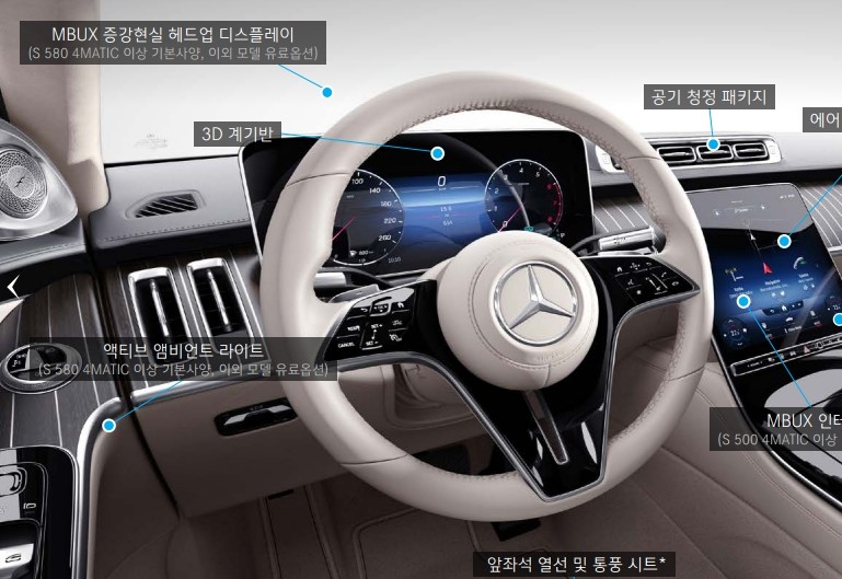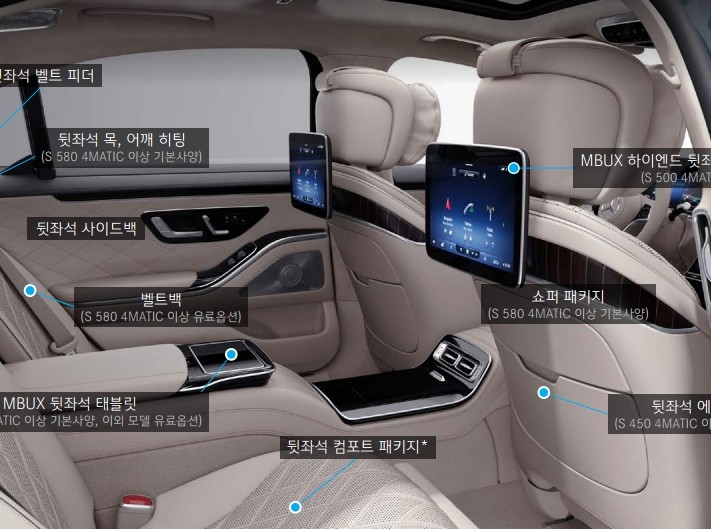 S500 4MATIC은 1열 멀티 컨투어 시트와 고급스러운 헤드레스트를 제공합니다. 새로운 트림 450d AMG 라인은 AMG 라인 외관, 20인치 휠, 나파 가죽 시트, 다기능 나파 가죽 스포츠 스티어링 휠, 2열 전동 시트, 1열 및 2열 시트 메모리, 부스터 3D 사운드 시스템을 갖추고 있습니다.
