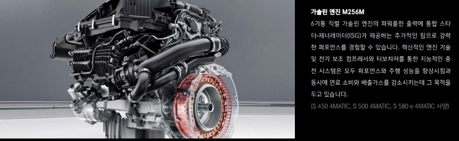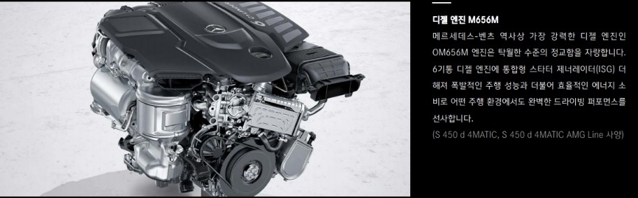 S450d 4 MATIC은 3.0리터 직렬 6기통 M656M 디젤 엔진과 48V 마일드 하이브리드 시스템, 9단 자동변속기를 조합해 최고출력 367마력, 최대토크 76.5kgm의 성능을 발휘합니다. 정지상태에서 시속 100km까지 5초 만에 가속됩니다. 가솔린 450-4MATIC과 500-4MATIC은 기존과 같습니다.